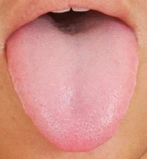 - No coating: shiny pink tongue implies good oral health and hydration.